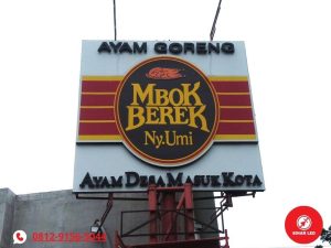 Desain bentuknya menyesuaikan dengan keinginan Anda. Kebanyakan orang membuat seperti logo usaha mereka. Penerangan menggunakan LED sehingga lebih hemat listrik.
