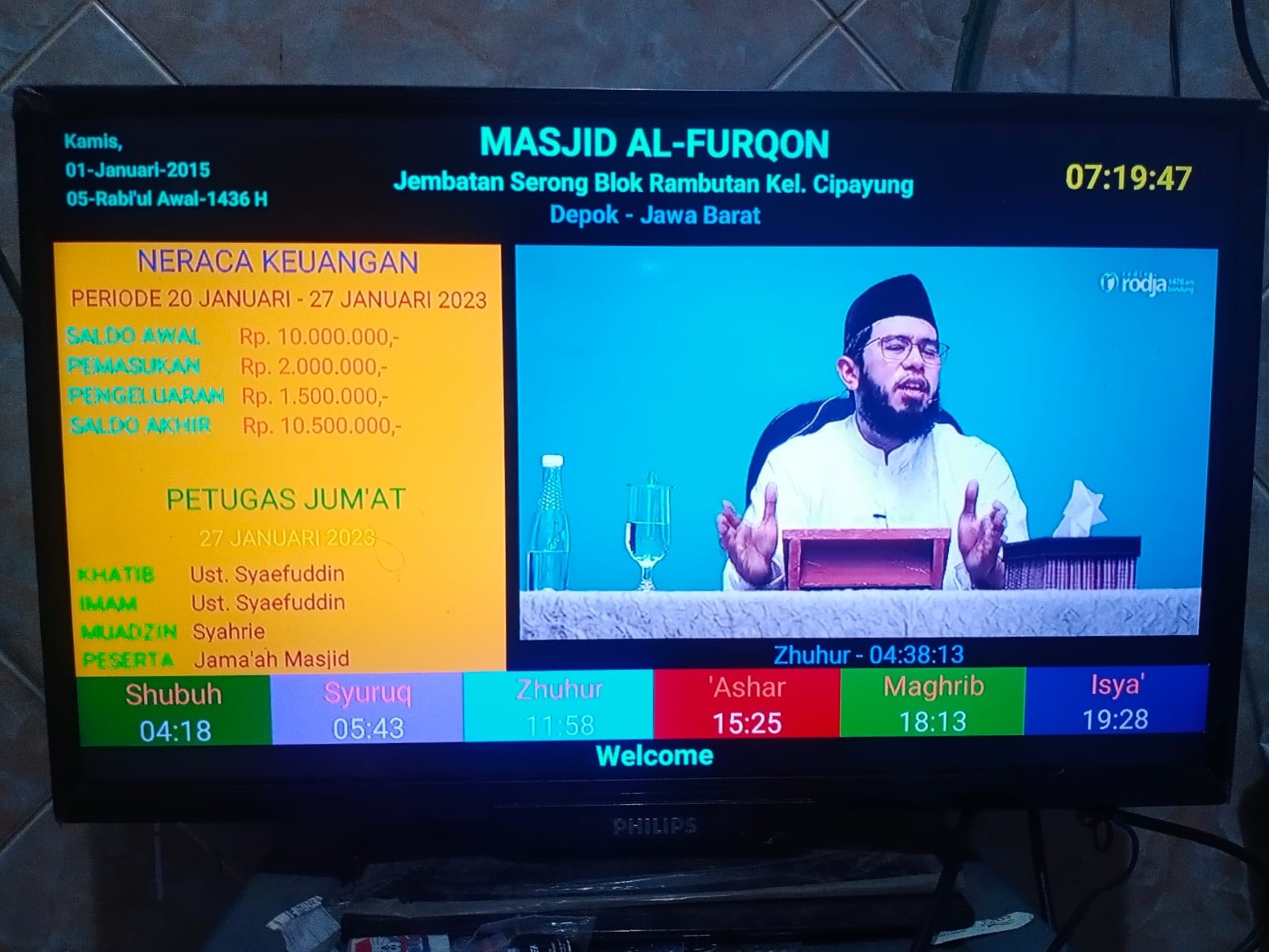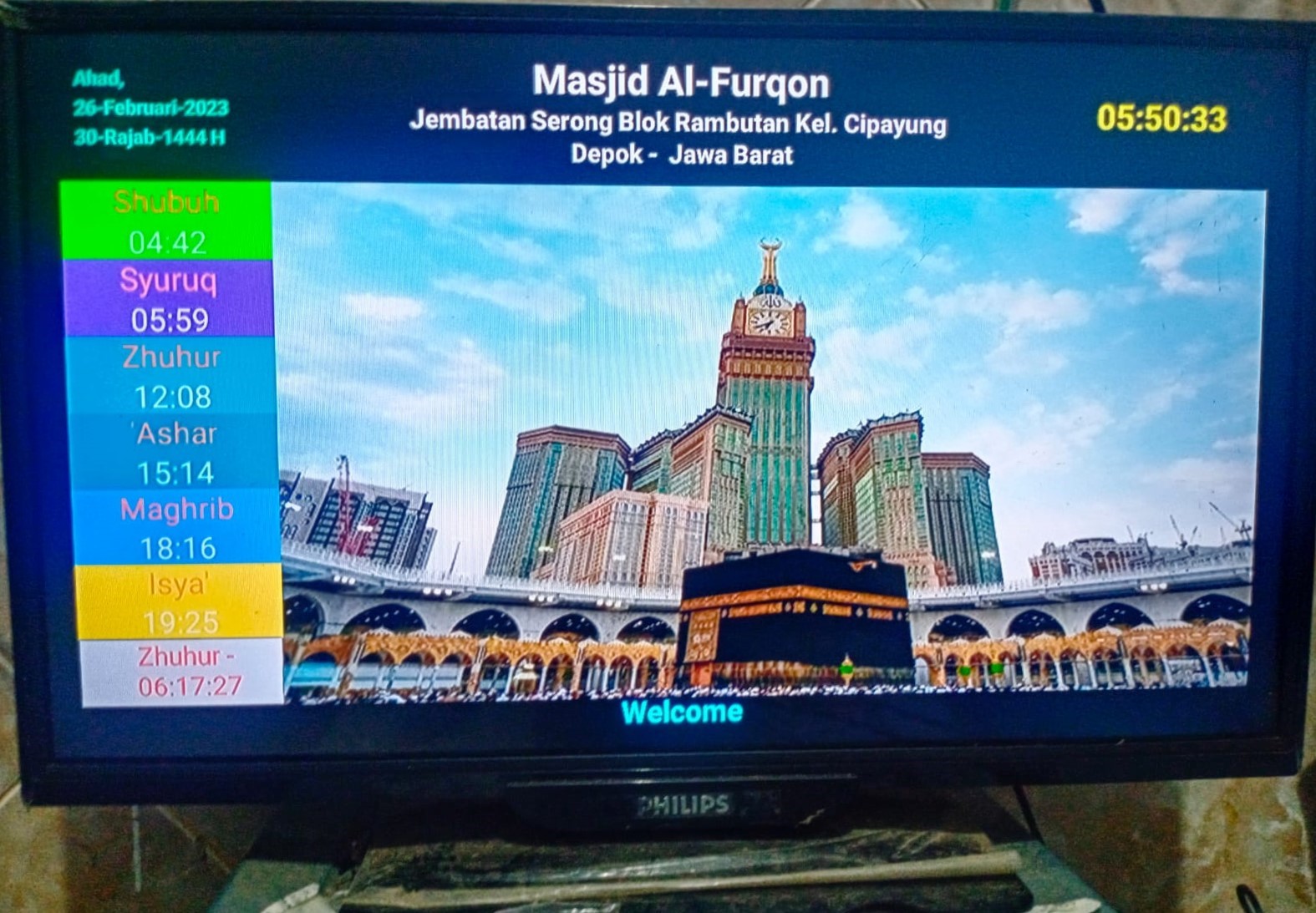 Menjaga ketepatan waktu ibadah, menampilkan jadwal sholat otomatis sesuai lokasi, serta mempermudah penyampaian informasi kepada jamaah melalui running text.