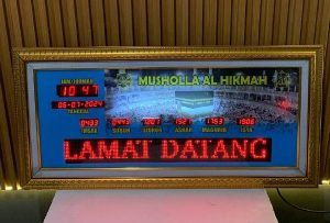 Jam Masjid Digital yang menampilkan jam dan tanggal (masehi/hijriyah) serta 5 waktu sholat secara otomatis. Dilengkapi juga buzzer saat masuk waktu sholat dan timer waktu iqomah yang dapat di atur. Sebagai fitur tambahan juga tersedia beberapa model dengan fitur running text untuk menampilkan informasi, azan, tilawah serta remote control.